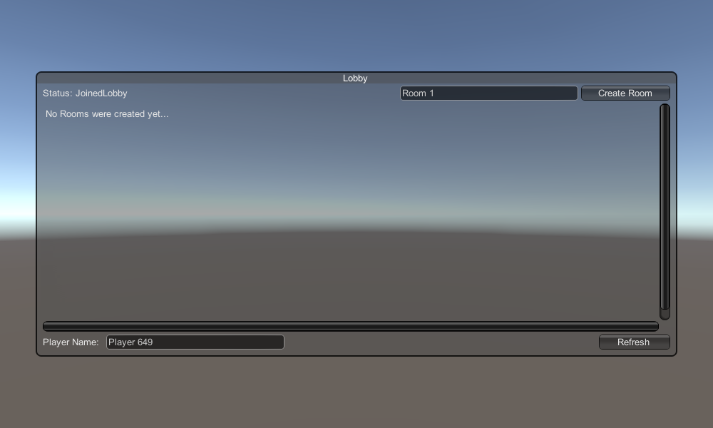 로비 로직(기존 룸 탐색, 새 룸 생성 등)을 포함하는 로비 장면을 생성하는 것부터 시작해 보겠습니다.
