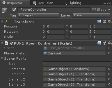 - _RoomController 개체에 PUN2_RoomController 스크립트를 연결합니다.