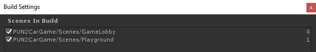 - GameLobby 및 Playground 장면을 모두 빌드 설정에 추가합니다.
