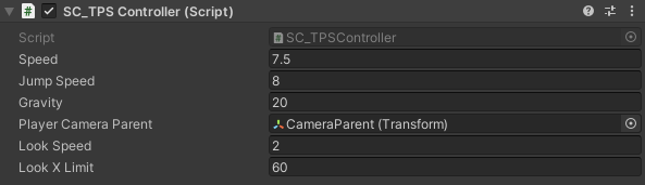 }- SC_TPSController 스크립트를 "Player" 개체에 연결합니다. (Character Controller라는 또 다른 구성 요소도 추가되었음을 알 수 있습니다. 중심 값을 (0, 1, 0)으로 변경합니다.)