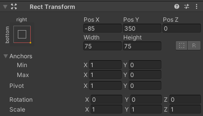 - "JoystickRight" Rect Transform 값을 아래 스크린샷과 동일하게 설정합니다.