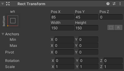 - "JoystickLeftButton" Rect Transform 값을 아래 스크린샷과 동일하게 설정합니다.