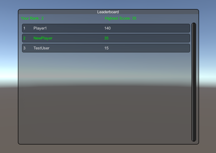 모든 것이 설정된 후 리더보드를 클릭하면 점수를 기준으로 상위 100명의 플레이어와 함께 점수/순위가 로드됩니다.