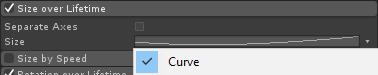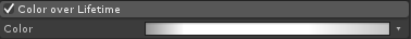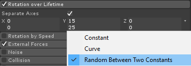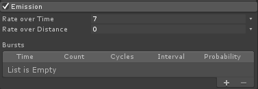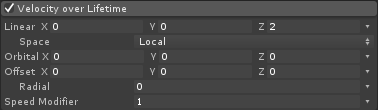 - 파티클 시스템에서 다음 모듈을 활성화합니다: Emission, Shape, Velocity over Lifetime, Color over Lifetime, Size over Lifetime , 수명에 따른 회전, 외부 힘, 렌더러.
