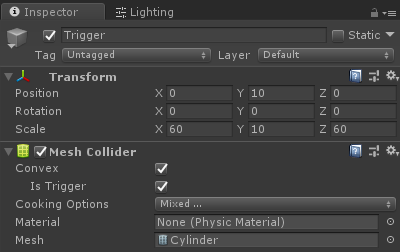 - "Trigger" GameObject에 MeshCollider 구성 요소를 추가하고 Convex 및 IsTrigger 확인란을 선택한 다음 해당 메시를 기본 실린더로 변경합니다.